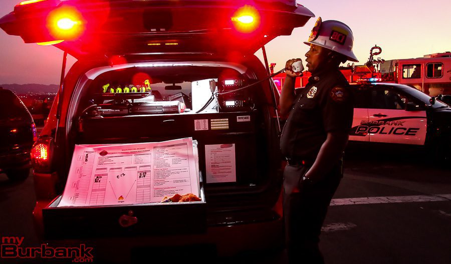 Burbank Fire dispatched 3 engine companies a rescue ambulance and Battalion Chief Tray White to the incident, Engine 16 located nearby were the first on the scene reporting a small area of grass burning heading downhill with no prevailing winds. The crew from Engine 16 was right next to a fire hydrant for a supply of water to help extinguish the fire.