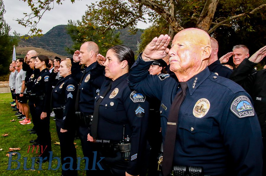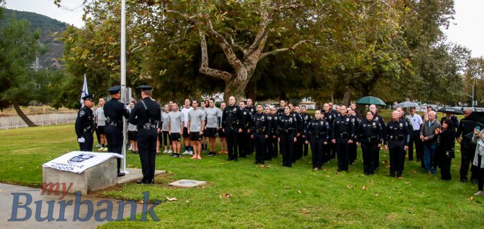 Included in today’s ceremony, which was held fittingly under gray skies and light rain, both because it added to the solemnity of the occasion but also, as was said during Burbank’s former Mayor Michael Hastings’ speech, that it was also raining the evening Officer Pavelka was killed. There was also the announcement of a permanent Burbank Police Cadets Scholarship named in honor of Officer Pavelka’s memory.