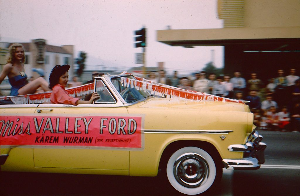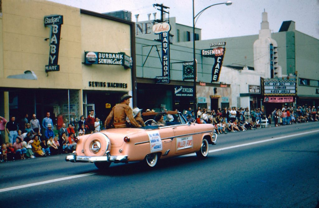 Mr. McGinnis took a number of Kodachrome slides in the early 1950’s including a number of Burbank On Parade pictures in brilliant color. At this time the parade was on San Fernando Road and headed north along the very crowded street.