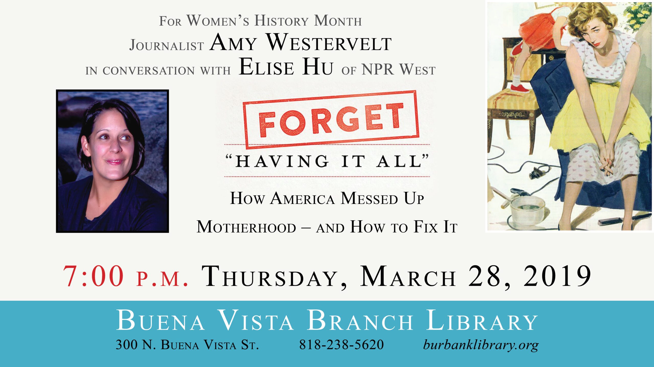 Author Amy Westervelt visits the Buena Vista branch of the Burbank Public Library on Thursday, March 28, to talk about the cultural and policy changes that need to be made to support working mothers in the United States, as she examines in recently-published Forget “Having It All”: How America Messed Up Motherhood — and How to Fix It.