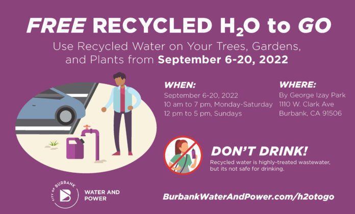 Burbank Water and Power (BWP) will open a free community recycled water fill station from September 6-20, 2022, for community members impacted by the Metropolitan Water District (MWD) of Southern California emergency repair of the upper feeder pipeline. Residents and businesses are invited to bring a 1-to-300-gallon container with a leakproof lid to the fill station to offset their outdoor watering needs.
