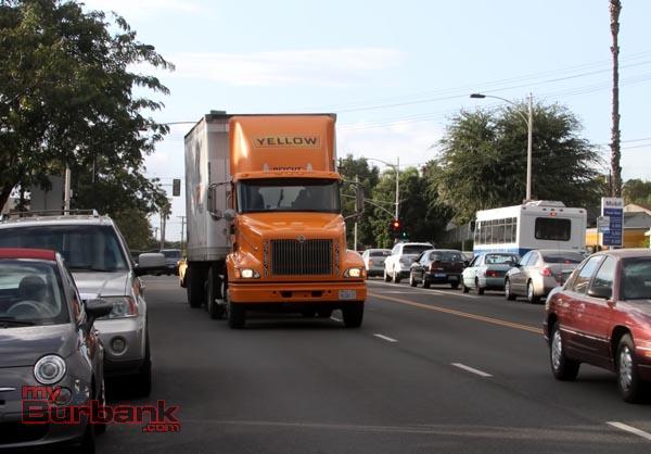 Semi trucks were forced to use Burbank streets after the I-5 closure. (Photo By Ross A. Benson)