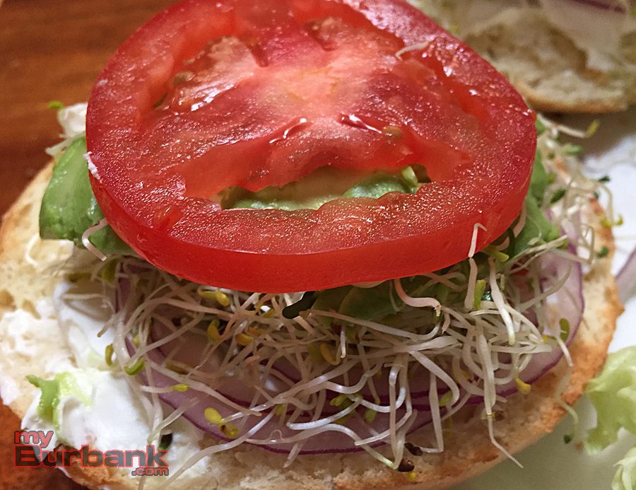 The other big plate we dug into – the Deli Plate – included a toasted bagel with cream cheese (vegan cream cheese is available), sliced tomato, fresh alfalfa sprouts, lettuce and red onion. I added half a sliced avocado, to bring the plate’s total price to $8.50.