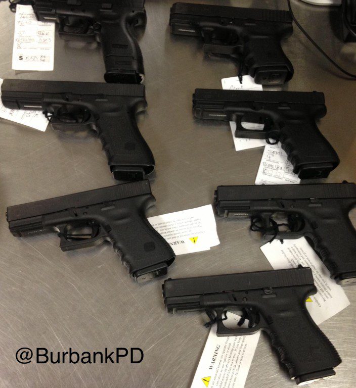 Detectives, who had obtained a search warrant for Zmrukhtyan, his residence and vehicle, located all seven stolen handguns in the crawl space of his apartment building. In addition, bolt cutters, a pry bar and methamphetamine was located in the getaway vehicle. The vehicle Zmrukhtyan was driving was determined to be stolen from Van Nuys.