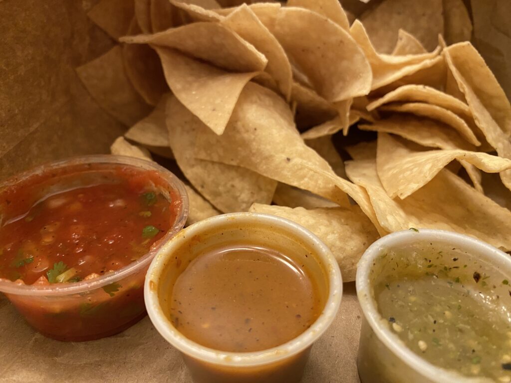 Our to-go order came with a bag of chips and some fresh red salsa that’s on the sweet side, a spicy red salsa with great flavor and a mild green salsa.