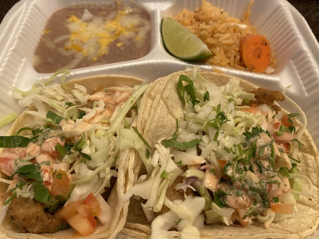The fish, shrimp and potato tacos were all delicious and very fresh tasting. The potato taco of mashed potato, topped with cilantro, tomato, onion, cabbage and shredded cheese, was tucked inside a lightly fried tortilla. It was simple and very, very good.