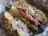 Then there’s the toppings: red onion, capers, dill, salted cucumber, tomato, radish, pickled onion, sprouts, avocado, bacon, whitefish salad, salmon caviar and gravlax (cured, not smoked, salmon.)