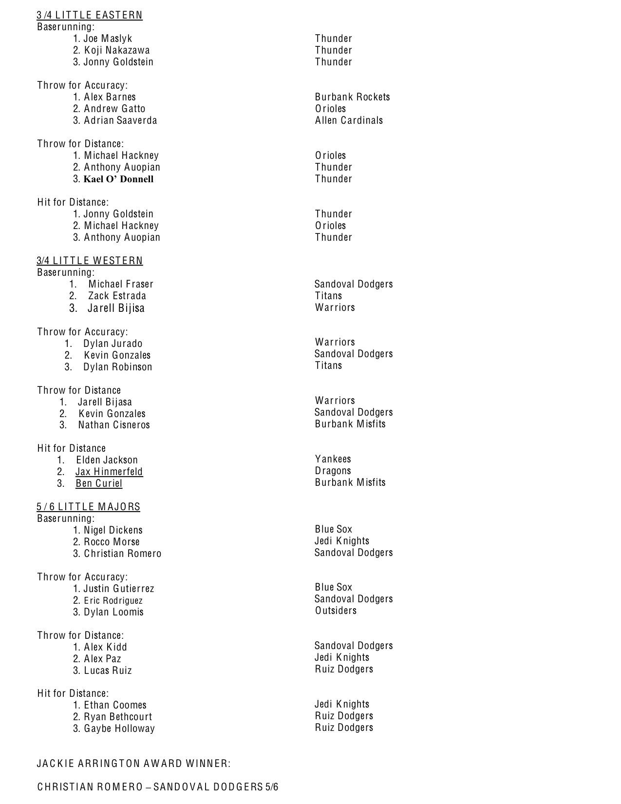 Burbank Park and Recreation held its annual Hap Minor Civitan Day last weekend. Here is a photo gallery and the final results by event for every age group. A special congratulations to Christian Romero of the Sandoval Dodgers 5/6 who received the prestigious Jackie Arrington Memorial Award for sportsmanship!