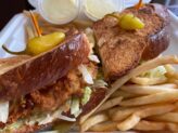Miracle Bakery’s fried chicken sandwich is one of the best we’ve ever had. We enjoyed their take, nestling beautifully fried chicken breast, chipotle mayo, pickles and coleslaw inside toasted challah bread and garnished with pickled banana peppers. The accompanying shoestring french fries were perfectly seasoned.