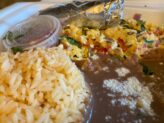 We ordered the breakfast burrito con papas, substituting the potatoes for rice, and found the combination with eggs, refried beans, onions, bell pepper, cheddar cheese and bacon to be perfectly made.
