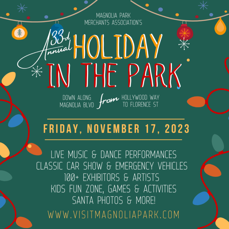 Holiday in the Park (HITP) is put on by the Magnolia Park Merchants Association and this will be their 33rd annual event. Planned for Friday, November 17th from 5:00 PM-9:00 PM, the HITP committee has already started organizing the event and opened registration for exhibitors, sponsors, food trucks, and classic cars.