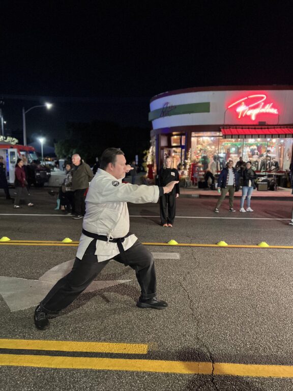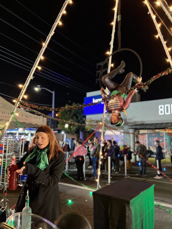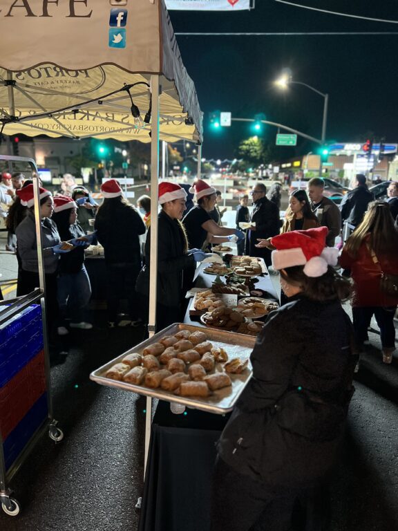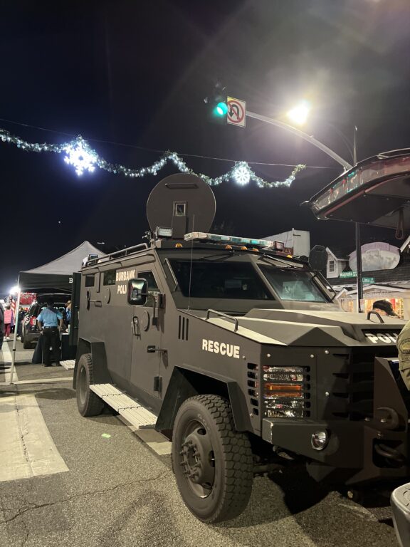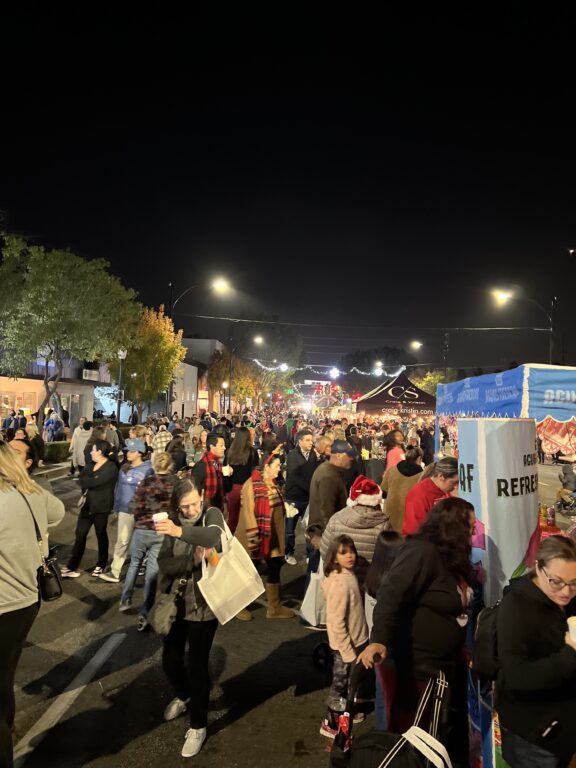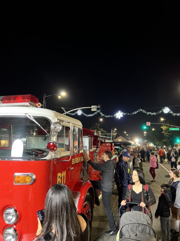 The event includes a classic car show sponsored by the Burbank Road Kings, an art fair in the parking lot of Blast from the Past, a music stage in the Bank of America parking lot sponsored by Elevate Burbank, and a family fun zone sponsored by South Hills Church featuring rides, games, crafts, and more. Over 25 food trucks can be found down the side streets and many vendors pass out complimentary coffee, hot cocoa, candy, cookies, and other goodies.