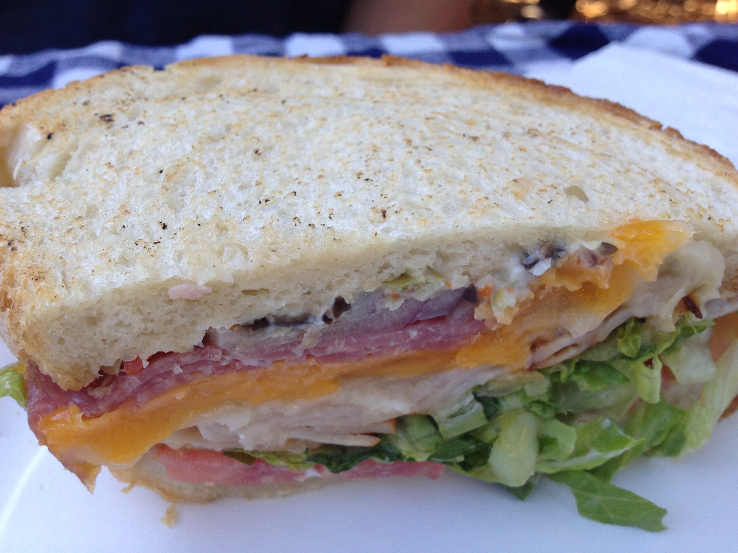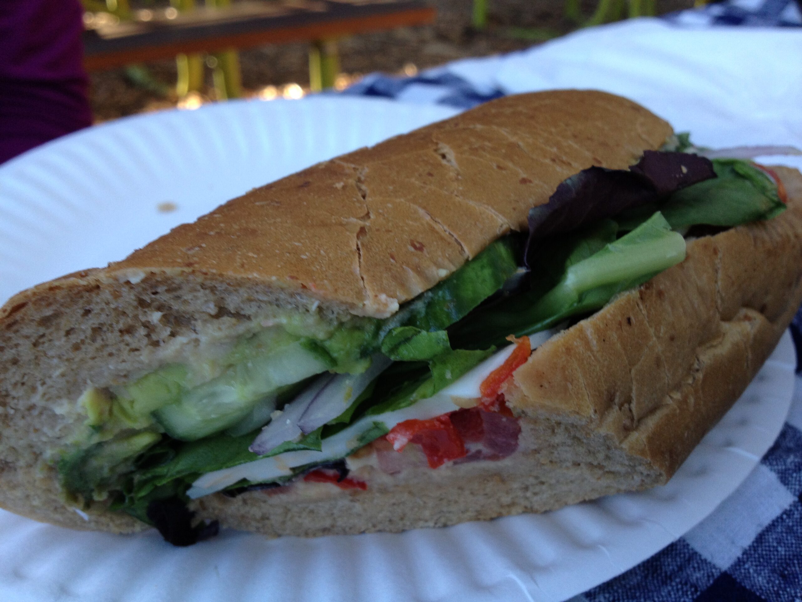 Most recently, we shared a Veggie sub and a Muffaletta for our picnic. Filled with vegetables such as mixed greens, cucumbers, tomato, roasted red peppers, avocado, and red onion, the sub adds aged provolone and hummus for protein and packs it all into a tasty wheat roll.