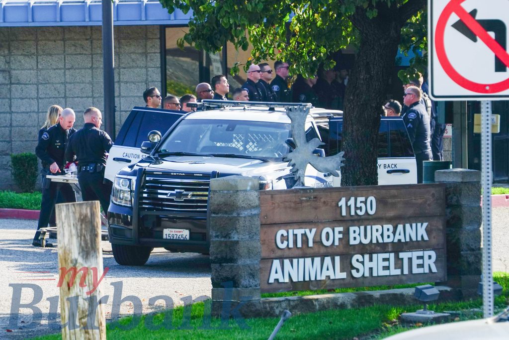 Officer Corey Salas, Spike’s handler and partner, drove Spike from the Burbank Animal Shelter to the station, led by a solemn procession of police motorcycles and patrol vehicles. As he arrived, K9 officers from neighboring departments stood united at the intersection, their dogs by their sides, forming a circle of love and protection. It was a moment that needed no words, and was felt by everyone in attendance.