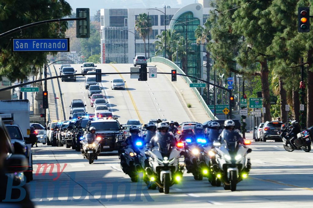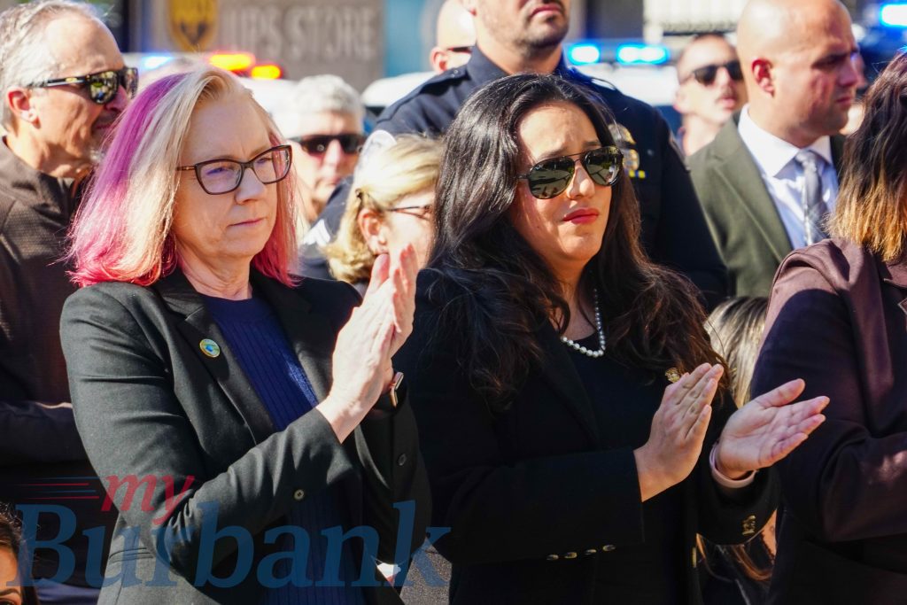 After Spike was carried inside, Officer Salas joined his wife and young children in the front row, surrounded by close friends, family, and fellow officers Mayor Nikki Perez addressed the crowd with words that captured the collective sorrow and gratitude felt throughout Burbank. “Today, I stand in solidarity with the entire Burbank community of neighbors and families who have spent the last week in mourning,” said Mayor Perez. “And of course, no one has felt this more deeply than the men and women of our Burbank Police Department.”