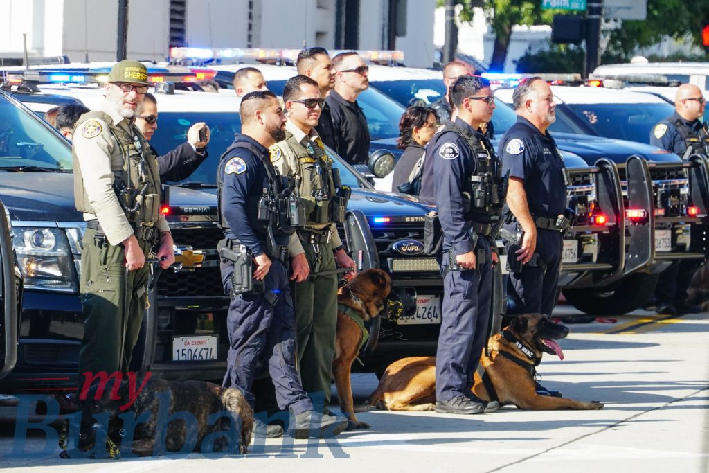 The memorial took place at the Burbank Police and Fire Headquarters, in front of the bronze Guardian sculpture, a fitting backdrop for a morning that honored Spike’s bravery and sacrifice. Third Street was closed from Palm Ave. to Olive Ave. as police vehicles lined the roadway, eventually spilling onto surrounding side streets. The turnout was so vast it became a visual reminder of how far Spike’s impact reached beyond city lines.