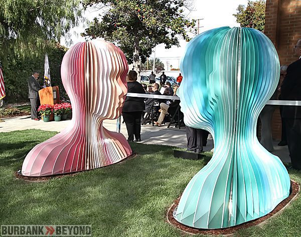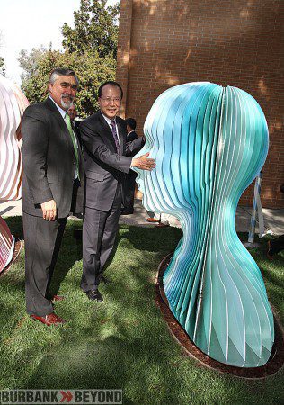 On Monday evening members of the Incheon Metropolitan City Dance Theatre preformed and on Tuesday they were back to preform during the unveiling and dedication of an art piece called, “Mutualism”, in the front of the Northwest Library. Joining the ribbon cutting ceremonies were Burbank Mayor Jess Talamantes, along with Mr. Kim jin-Young, The Deputy Mayor for Political Affairs in Incheon Korea. Mr. Shin Yeon Sung Consul General of the Koren Consulate here in Los Angeles was also on hand.