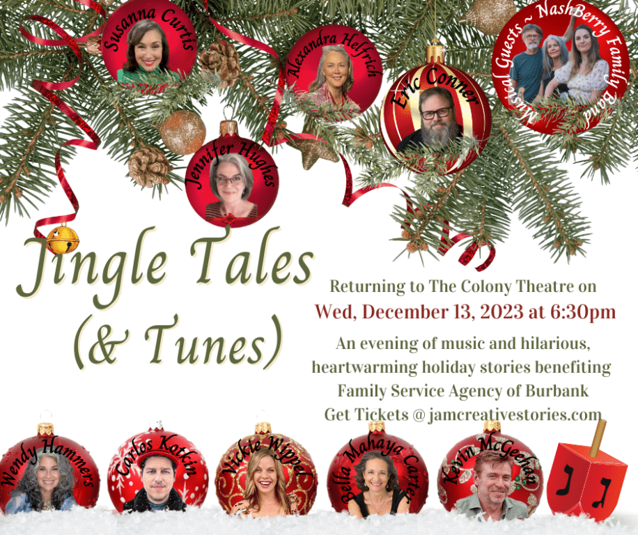 “So many of the stories in this year’s show make me laugh until my cheeks hurt,” said Suzanne Weerts, the Producing Artistic Director of JAM Creative. “I love that these shows are not only a gift to theatre goers but they also give us the chance to give a holiday present to Family Service Agency of Burbank. The holidays can be a difficult time for so many people, but to know that FSA is there for children, families, veterans, foster and emancipated youth, domestic violence survivors and anyone in our community facing mental health challenges is a great blessing and makes me and our whole cast so proud to be part of this meaningful and merry way to give back.”