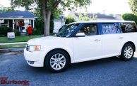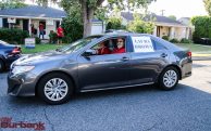 John Burroughs Choir member Laura Brown drives by the Melcher residence on Evergreen Street. (Photo by Ross A Benson)