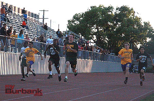 Julian Read of Luther Burbank (center) sprints his way into the record books in the 100 meter dash (Photo by Dick Dornan)