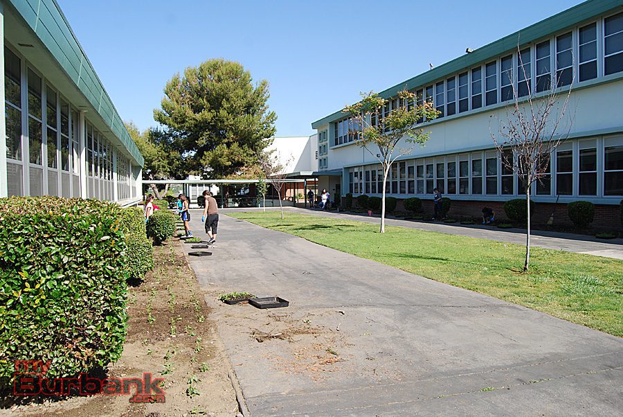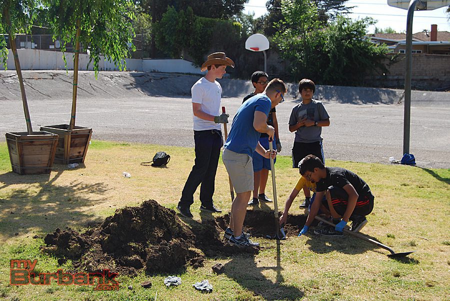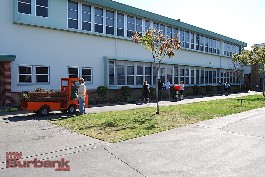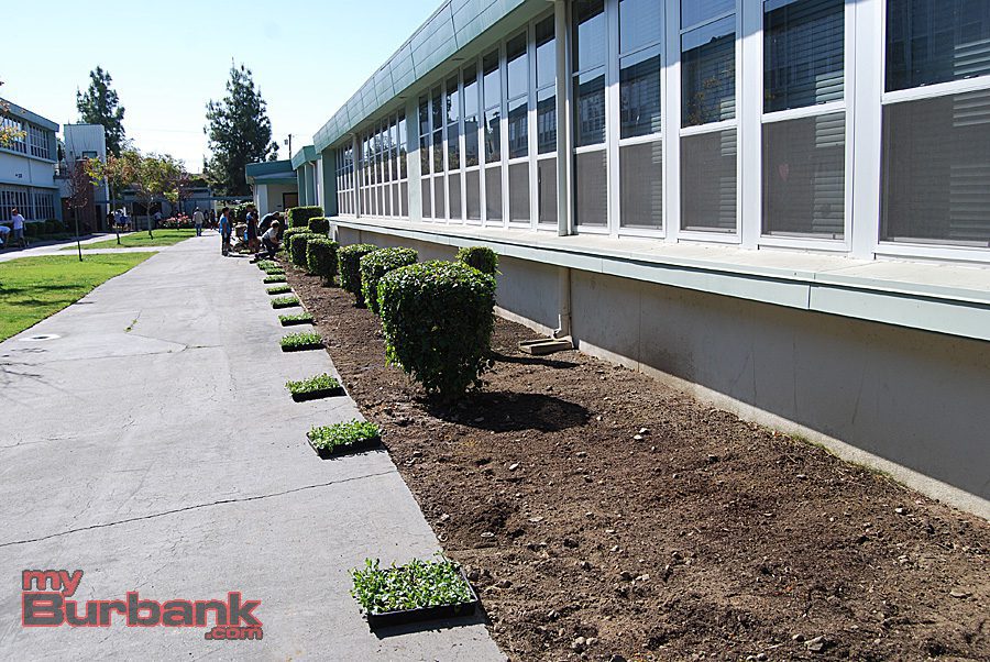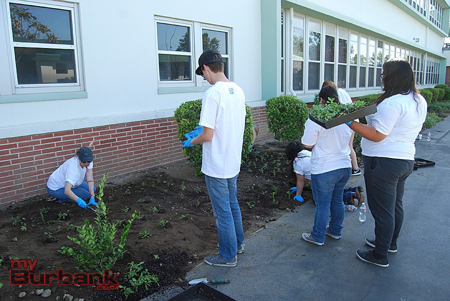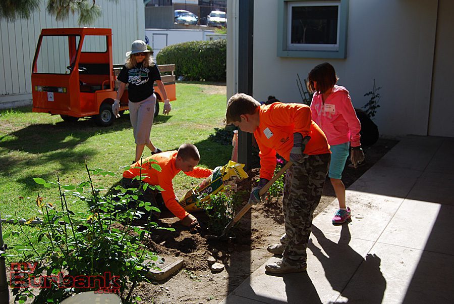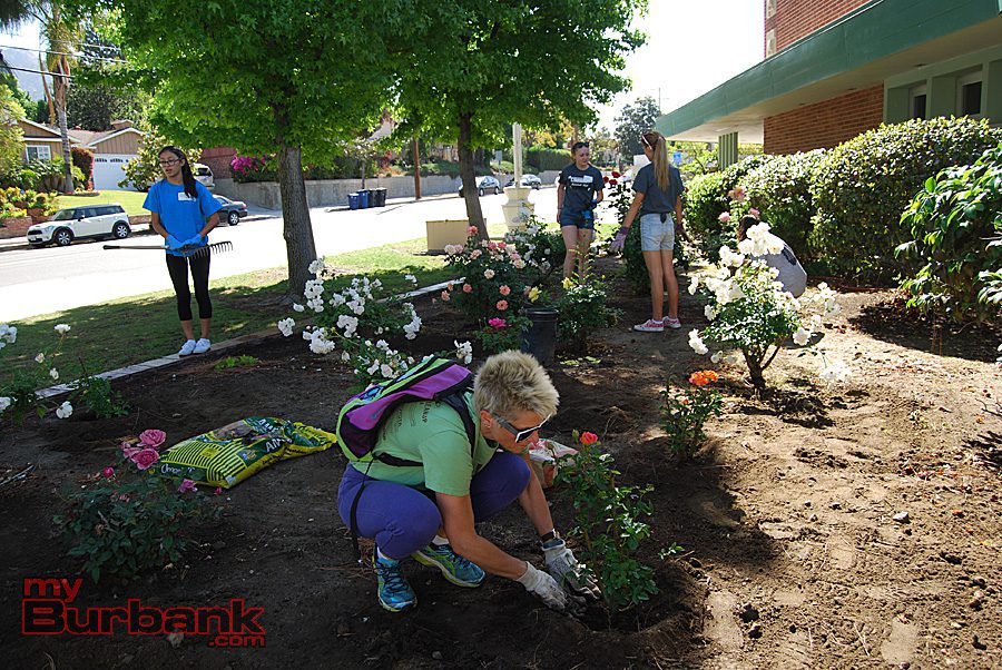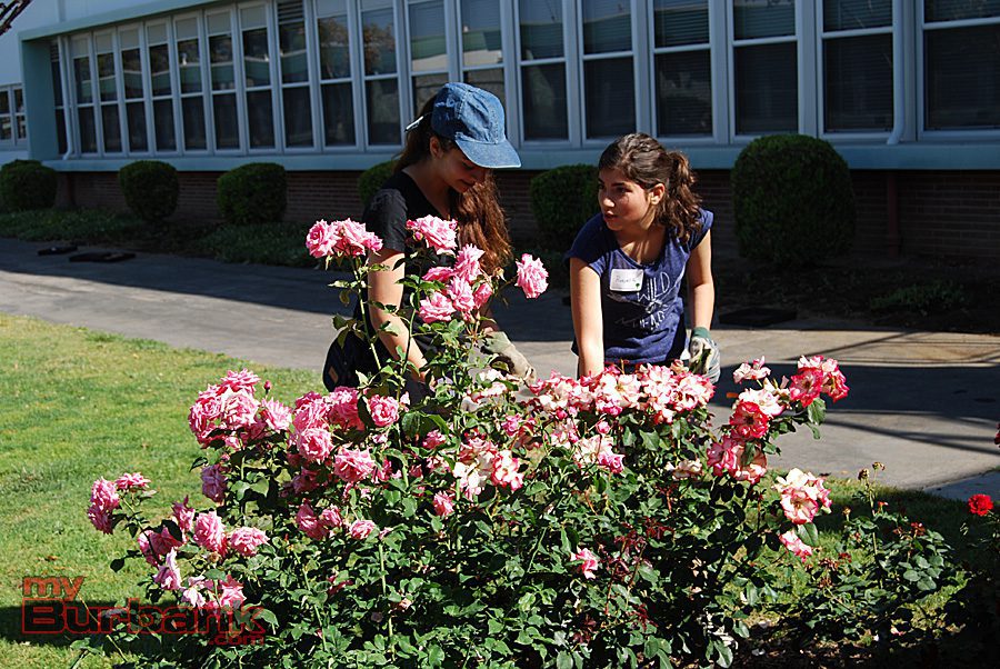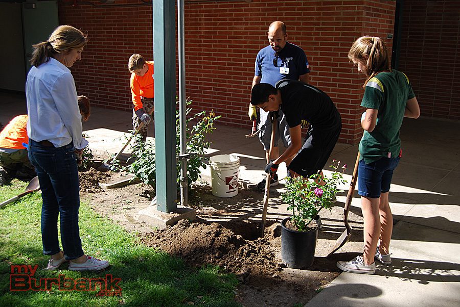 Volunteers plant colorful rose bushes near the entrance of John Muir Middle School. (Photo By Lisa Paredes)