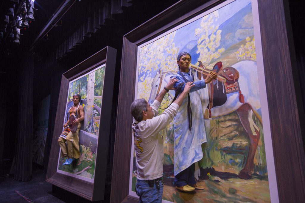 Not only are oil paintings represented, but even bronze, gold, and marble statues appear on the side stages. Act two takes viewers through the Harlem Renaissance with artists like Aaron Douglas, and then to East L.A’s Chicano art in the early 2000s, while wrapping it up with Laguna Beach artist, Roger Kuntz’s oil paintings.