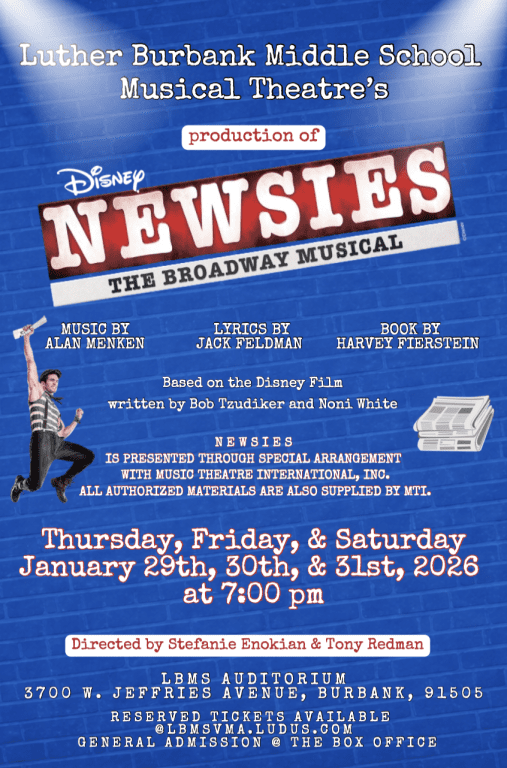 Luther Burbank Middle School’s Vocal Music Association will present Disney’s Newsies on January 29th, 30th, and 31st at 7:00 PM in the LBMS Auditorium (3700 W. Jeffries Ave., Burbank).