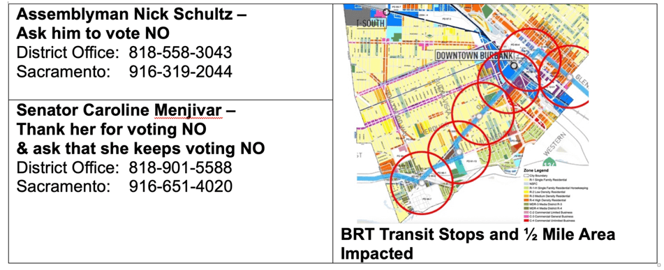 Help keep Burbank, Burbank.  Please contact your State Representatives and ask them to vote against SB79.  You can find your State Representatives at:  https://findyourrep.legislature.ca.gov
