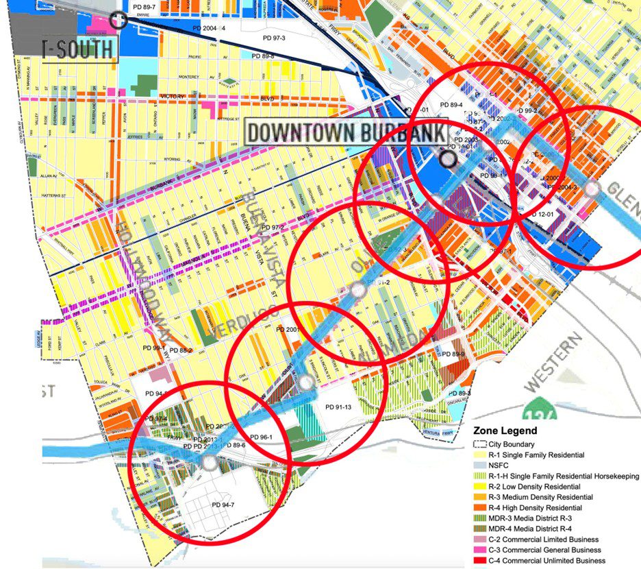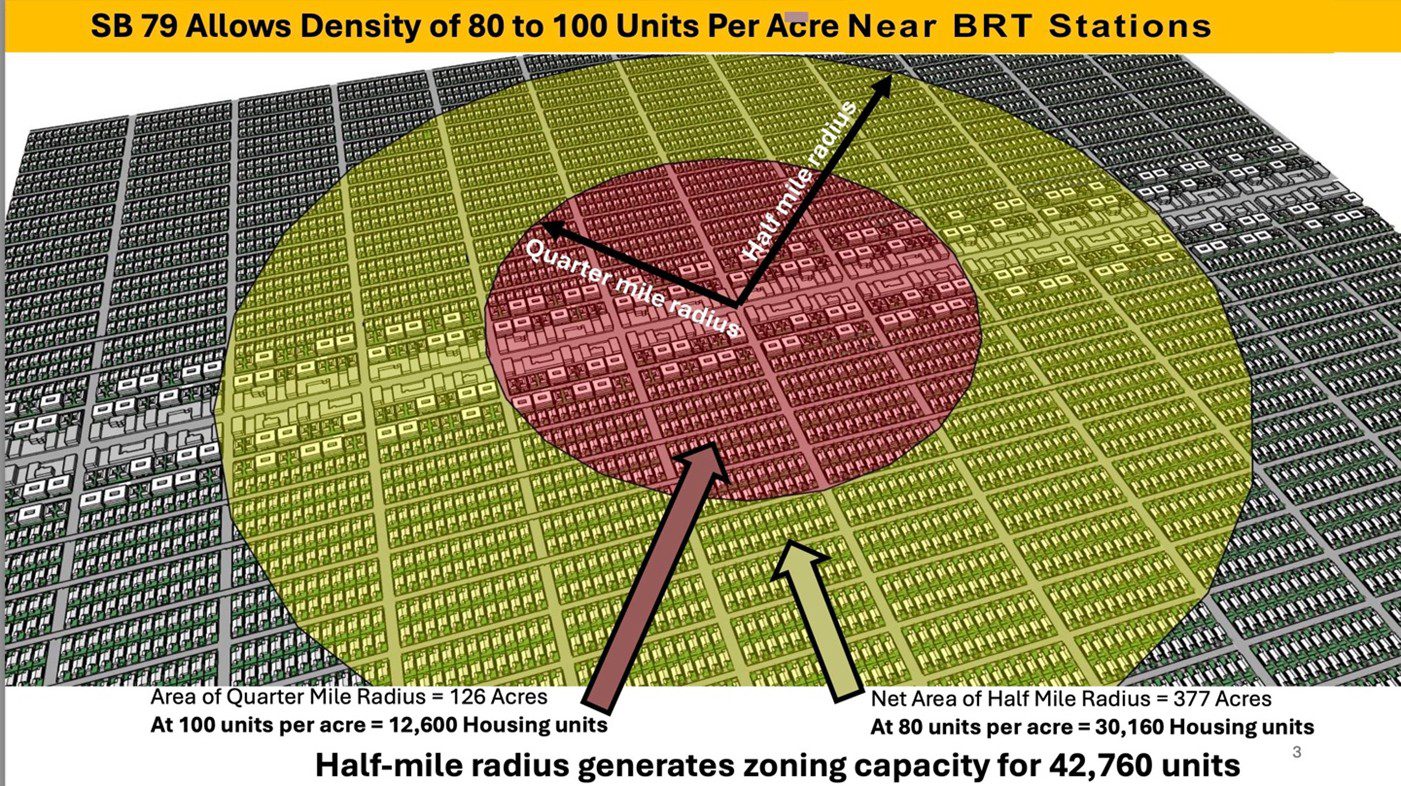 SB79 would prohibit the City from doing anything that would limit development to less than 100 dwelling units per acre within ¼ mail of BRT stations and 80 dwelling units per acre (DU/acre) within 1/4-1/2 mile on single-family and commercial lots.  That means that SB79 allows for the development of up to 35,210 to 42,760 dwelling units in the ½ mile radius circle around a single BRT station. It is the equivalent of nearly doubling Burbank’s entire housing stock within ½ mile of one single BRT station (fn 1).