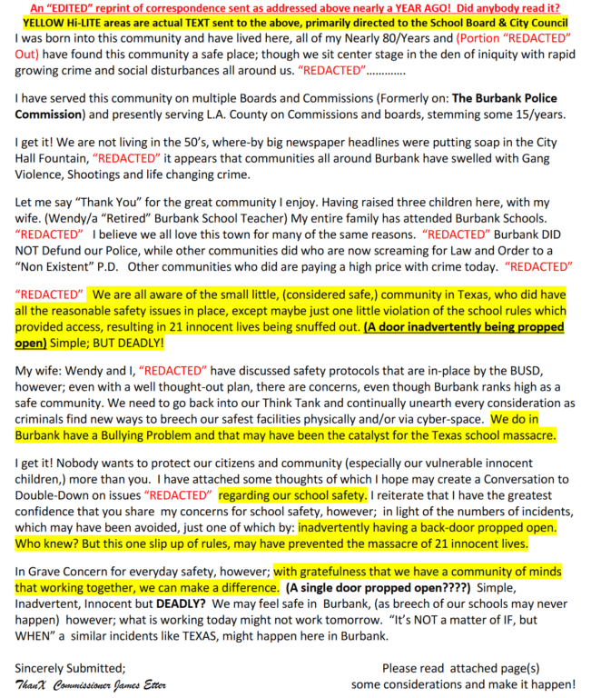“I had offered some remedy (see attached “Redacted” pages of original letter) to the School Board, with Copies sent to Burbank Police Chief Albanese and all the members of the Burbank City Council” (according to Commissioner Etter).