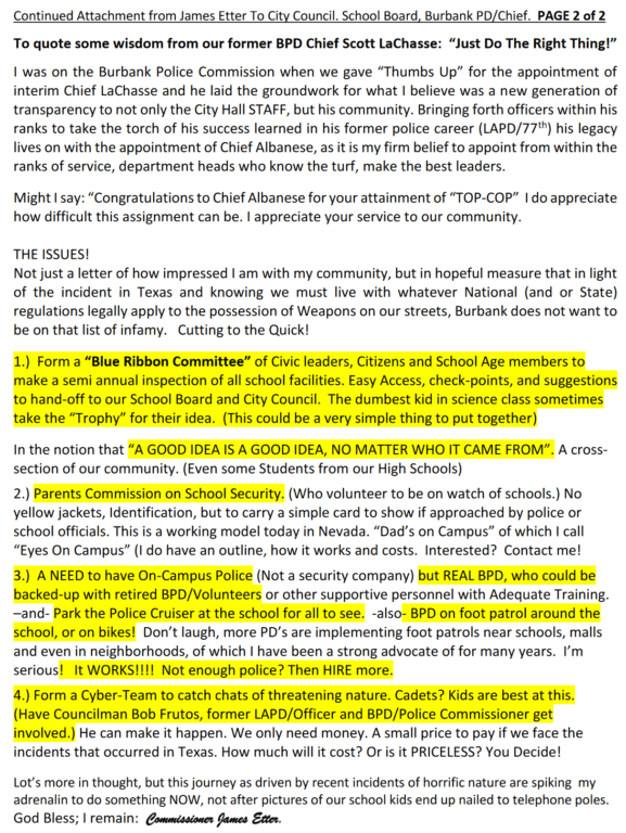 “There was some response from the City Council, however nothing much from The Burbank School Board, appearing lackadaisical or disinterested in the alarm being sounded; where-by I said in my correspondence: It’s not a matter of if, but When, similar circumstances perpetrated in Uvalde, Texas may lead to an assault on our own Hometown Schools.” According to Commissioner Etter.