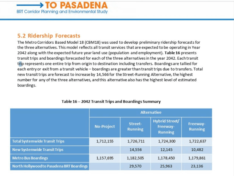 Per EIR – Table 16 presents transit trips and boardings forecasted in the year 2042. Each transit trip represents one entire trip from origin to destination including transfers. Boardings are tallied for each entry or exit from a transit vehicle – boardings are greater than transit trips due to transfers. Total new transit trips are forecast to increase by 14,566 for the Street-Running Alternative, the highest number for any of the three alternatives, and this alternative also has the highest level of estimated boardings. Table 16 – 2042 Transit Trips and Boardings