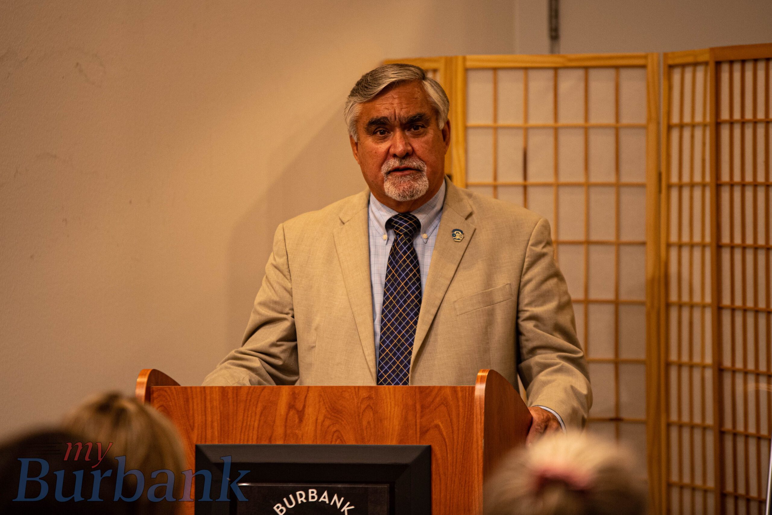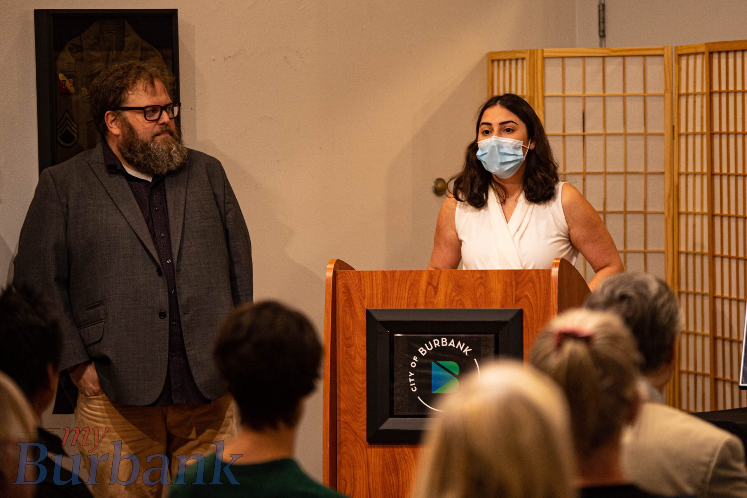 Eric Conner of the Burbank Cultural Arts Commission was presented with a California State Senate Certificate of Recognition to acknowledge the Celebration of the Life and Artistry of Alice Asmar Exhibit by Arda Tchakian of Senator Anthony Portantino’s office. ( Photo by Austin Gebhardt)
