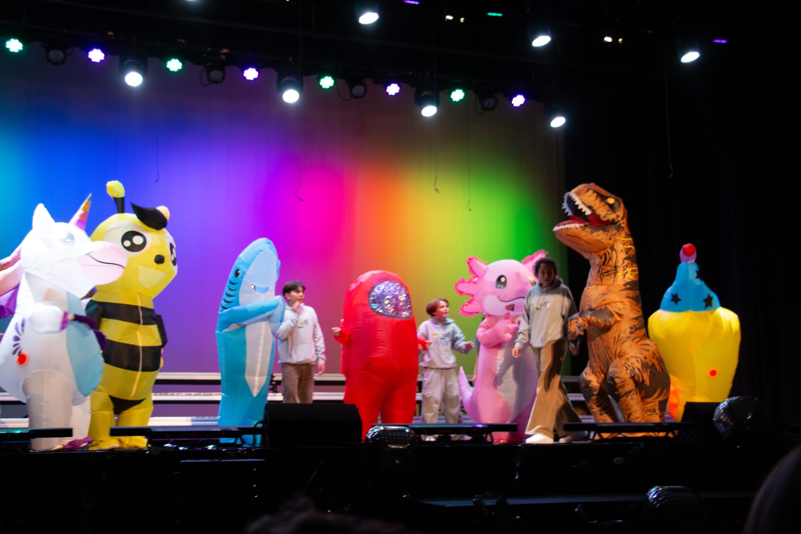 A panel of student judges had the task of deciphering the mystery, asking yes-or-no questions before taking their best guesses. The disguised contestants included a colorful lineup of characters: an Among Us alien, an upside-down clown, a dinosaur, a shark, an axolotl, a unicorn, and a bee.