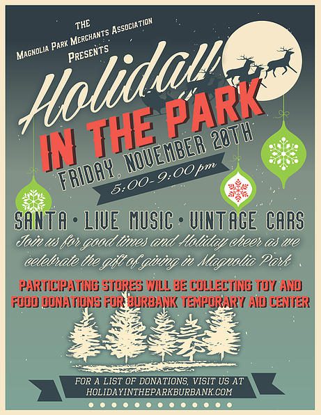 “We’re working on planning Holiday in the Park and started a go fund me account to raise money to help us keep the tradition alive and bring this beautiful event back to the Burbank community year after year,” said Erikson. The Magnolia Park Merchants Association seeks donations to cover the $11,000 cost of the decorative holiday wreath and lights swag via a gofundme page located here.