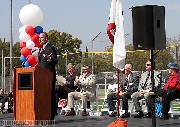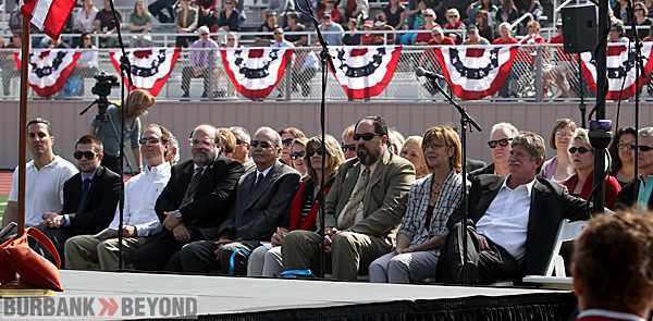 Several thousand people gathered in the home stands as the field was dedicated by a panel of honorees that included Chief of the Veterans Commemorative Committee Mickey DePalo, Mayor Jesse Talamantes, City Manager Michael Flad, Board of Education President Ted Bunch and Burbank Unified Schools’ Superintendent Stan Carrizosa.