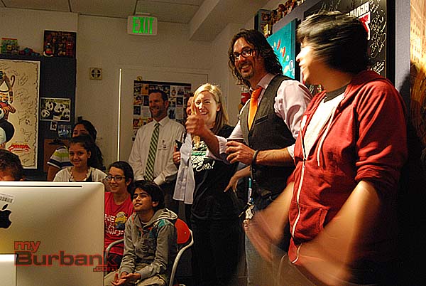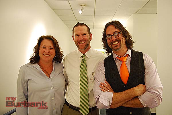 BUSD Visual and Performing Arts Coordinator Peggy Flynn, Muir Principal Dr. Greg Miller and Nickelodeon Manager of Audio Production Justin Brinsfield at Nickelodeon Animation Studios.(Photo By Lisa Paredes)