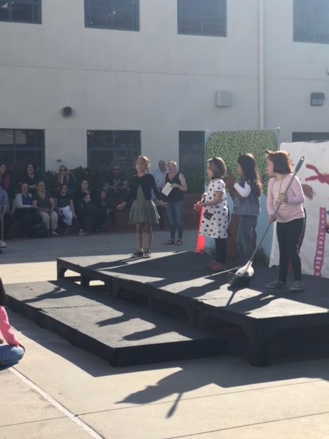 Jennifer Griffith’s first grade class wrote original fairy tales and then performed them on a stage in the Copeland Courtyard at the school. The stage was donated to the school by Burbank High School for use as an outdoor stage.