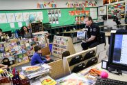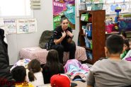 Board of Education members Armond Aghakhanian and Steve Frintner and school district staff including Superintendent Matt Hill, Muir Middle School Principal Greg Miller and Burbank High School Principal Michael Bertram also read to the children.Burbank Police Officer Angela Burrows talk to students at Miller Elementary. (Photo by Ross A Benson)