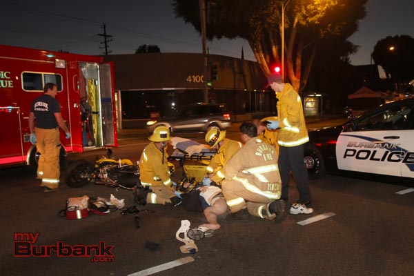 Burbank Fire Engine Companies now have a paramedic on each piece of equipment and in this case it was very beneficial as the rider suffered moderate injuries and was in great pain. Burbank Rescue Ambulance 15 arrived on scene and packaged the rider up after splinting his leg. They gave him pain medicine and transported him to a local hospital.