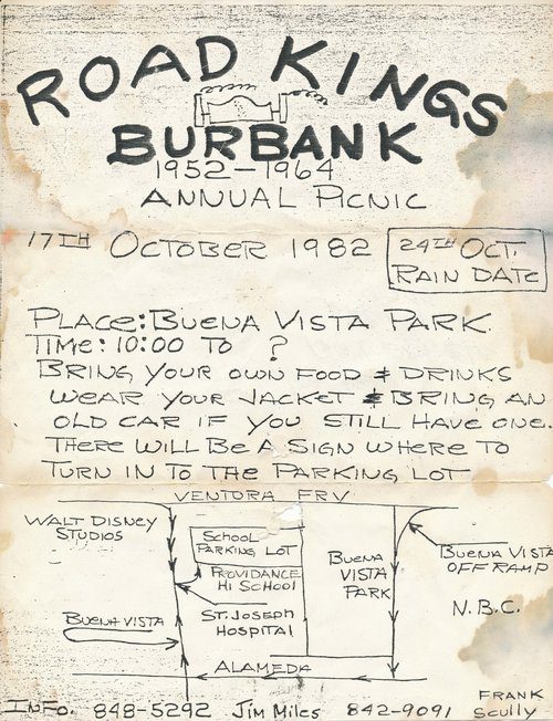 The Road Kings were established in November of 1952 and consisted of 17, 17 – 18 year olds from the City of Burbank. Initially the meetings were held once a week with dues a whopping 25 cents each week.