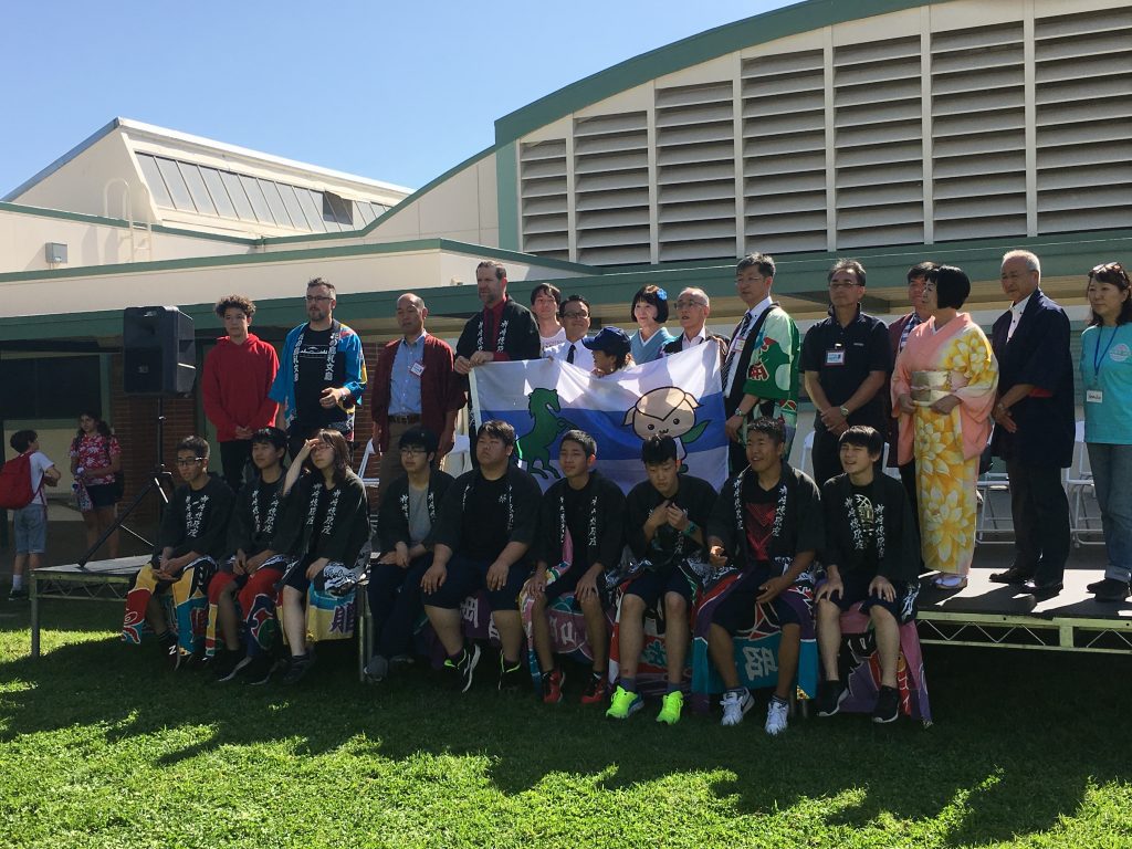 At Friday’s event, after the cultural activities, all Muir students joined the visiting Rebun students and officials, along with school faculty and administration on Mustang Field to witness the unveiling of the Sister School flag, which was designed by Muir teacher Amy Prosser and features the mascot of each school.