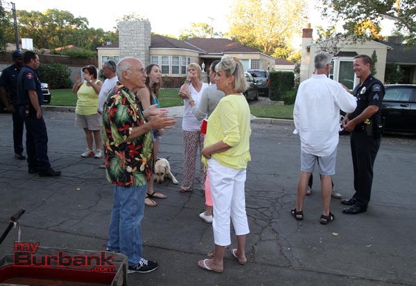 In addition to the gathering at Police headquarters, several citizens held block parties across town and handed out material that was provided by the Burbank Police Department’s Community Outreach and Personnel Services Bureau (COPS). A couple of the block parties served food, drinks and shared stories and had live music playing. One group even met at Bob’s Big Boy on Riverside Drive.