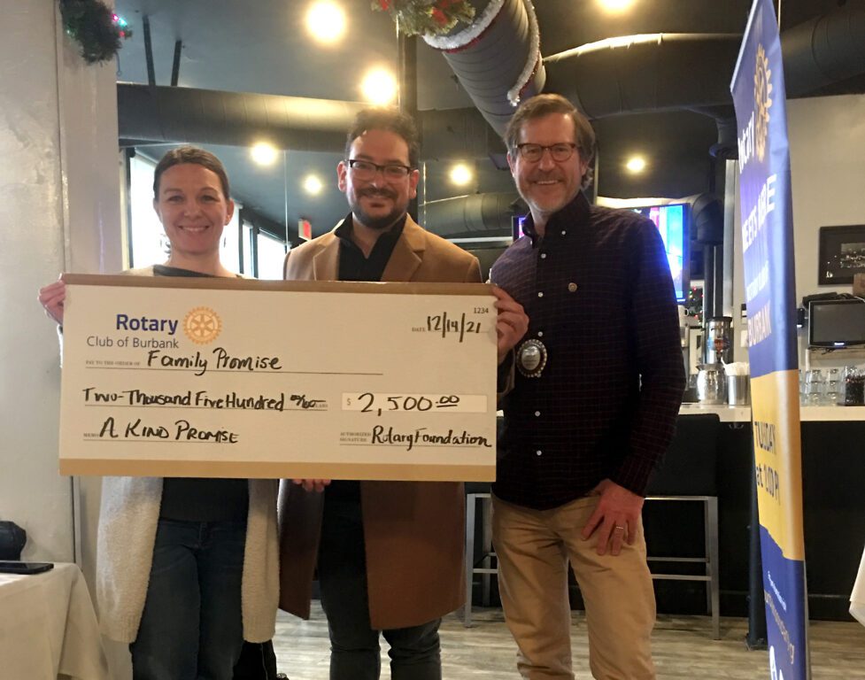 On December 14, 2021, at a regular meeting of the Rotary Club of Burbank, the Club presented a grant to Family Promise of the Verdugos in the amount of $2,500.00.