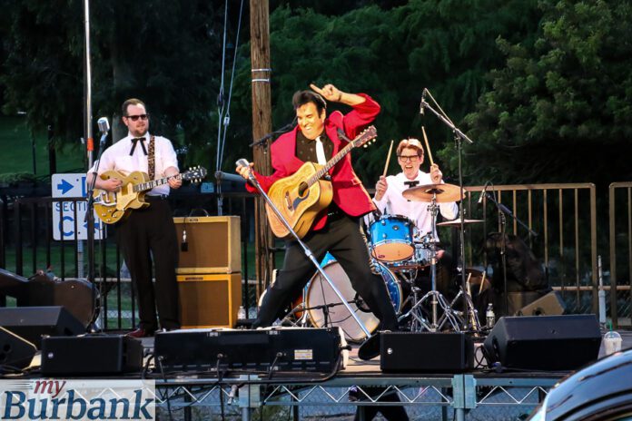 Rockin’ the stage was the Scot Bruce Band, which performed Elvis’ hits. Dressed in a red jacket, black slacks and white tie, lead singer Bruce had down all the King of Rock and Roll’s moves — from swiveling hips to swinging the microphone stand. The band opened with “Blue Suede Shoes” and completed the night with “You Ain’t Nothing but a Hound Dog”. Favorite songs received horn honks from those sItting in the driver seats.