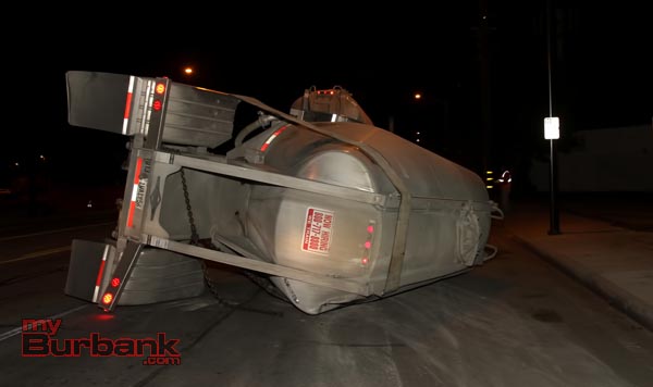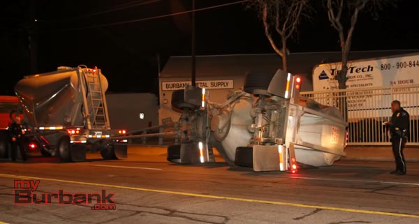 The Burbank Police & Fire Departments received calls of an overturned semi-truck on San Fernando Blvd and Ontario Street around 8:15 p.m. Saturday evening. Due to the nature of the call, the police dispatched units code 3 (lights & sirens) and the fire department dispatched a rescue response (an engine, truck company, paramedics and a Battalion Chief).