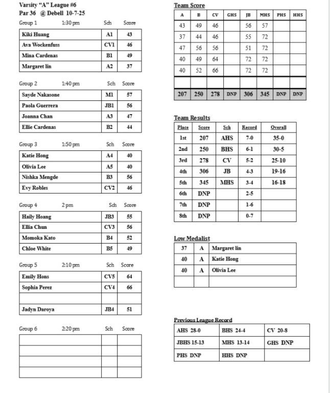 Pacific League Girls Golf Match No. 6 Results