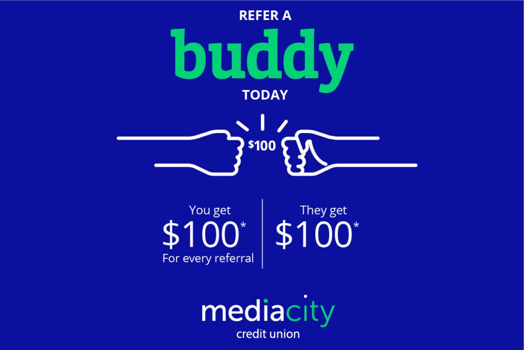 Media City Credit Union, a local financial cooperative who returns its earnings back to its Member-Owners, invites you to refer a buddy to open a checking account with Media City Credit Union. Media City CU’s Refer A Buddy program allows members to earn up to $100 for each friend that they refer. The friend may also receive up to $100.