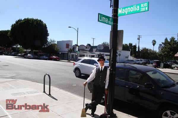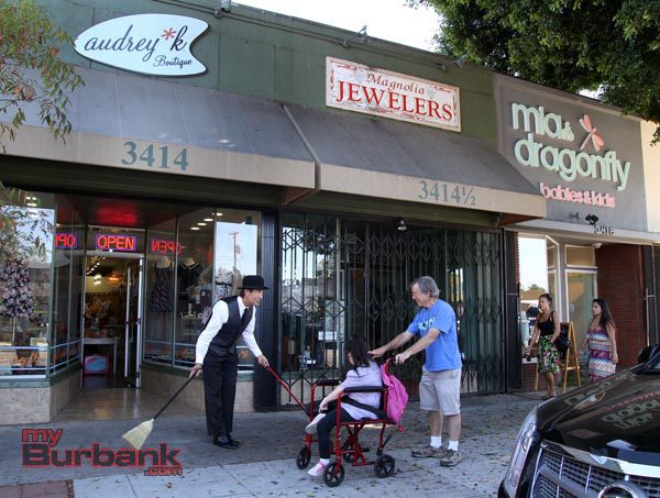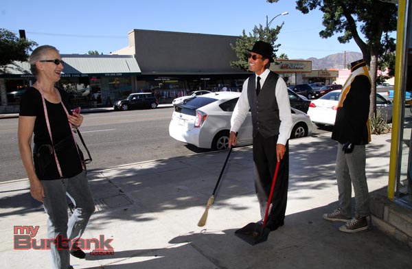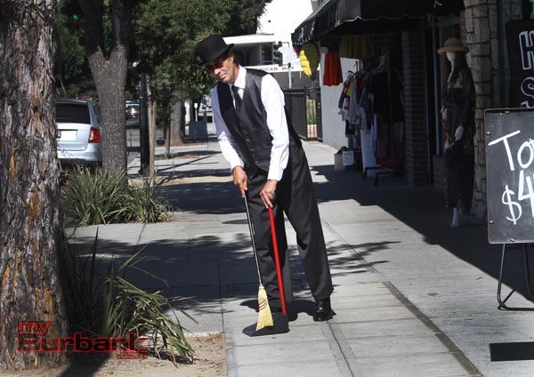 myBurbank.com last saw Rags Madison of RentaButler/Burbank as he was helping at a charity event pampering VIP’s and welcoming guests in his classy butler style. Imagine our surprise when visiting Magnolia Boulevard on a hot mid-August Saturday and watching as he swept up debris and swept into a local shop all passer’s by with a sing-song jingle he created just for that store and a pleasant but hard-to-resist pied piper banter.