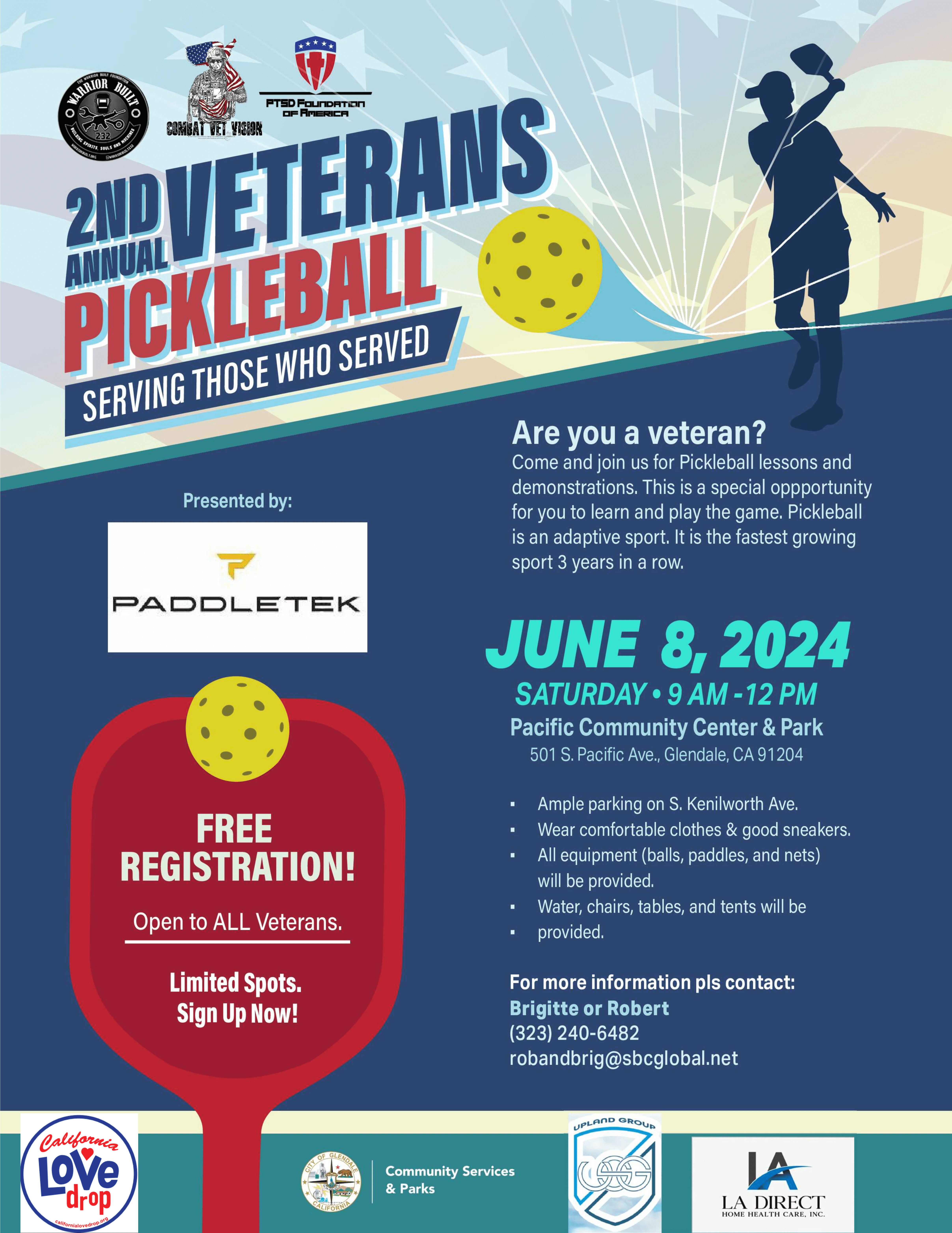 For all those veterans, being active both in mind and body are important and one way to do both is free to register for the Second Annual Veterans Pickleball event on June 8 at the Pacific Community Center & Park from 9 a.m. to noon. The address is 501 South Pacific Ave. in the city of Glendale.
